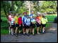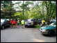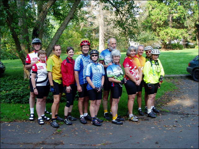 We packed the bike on top of the car and tried to organize our gear, leaving some in the car that would be left at the house. As usual we were rushed and a bit frantic by the time we arrived at the start. Of course Kerie was right; once the bike was together the front brake pads were sticking to the wheel, so I did what I could to adjust them. After repositioning the pads several times and reinstalling the wheel a few times, the wheel would almost spin free. As I was about to give up, I noticed that the cable housing was not seated properly in the guide and was causing too much tension on the cable. After resetting it, all was well. The riders gathered for a group photo; notice the two oddballs; everyone else is in matching outfits except us.