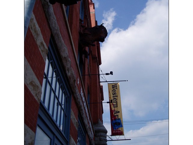 For an additional $4 we purchased entry to the nearby Rockwell Museum of Western Art (as far as I could tell, not related to Norman Rockwell), with a very good collection of artwork by Remington, Moran, Bierstadt, Rungius, and others. It was a quick visit as it was already 3 pm and we still had 20 miles to ride. While parking the bike, Kerie spotted the cute little bat hanging on the wall behind the museum (left photo). She also got a kick out of the buffalo sticking out of the front of the museum wall (right photo).