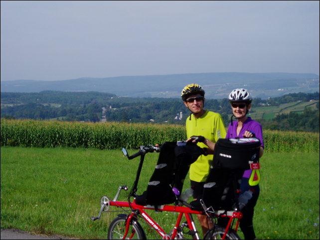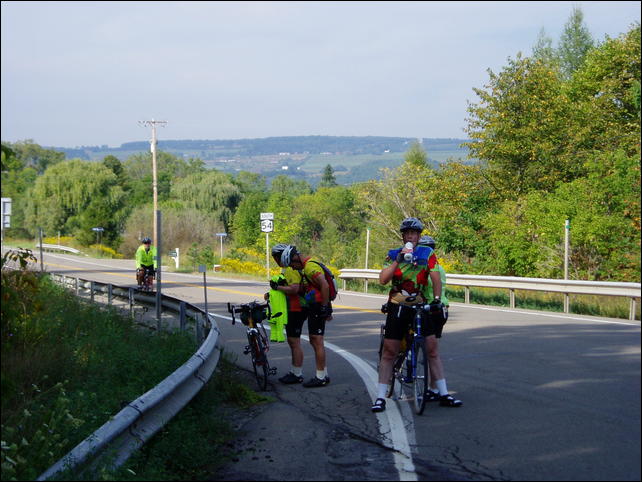 At 9 am Rich held the route meeting, discussing the two options for the day, 49.4 miles passing once again through Penn Yan with an option for another stop at the Adirondack deli, or the 57.3 mile ride that passed over the hill between Keuka Lake and Seneca Lake. We chose the longer, more scenic route. We were joined today by a couple from Rochester who drove down the night before, Laura and Frank. Frank dropped Laura off at the motel, drove to Elmira to leave the car and took a taxi back. He said he felt lucky to survive the hair-raising taxi ride.