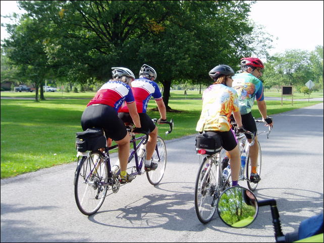 Outside of Geneva we were routed along a bike path parallel to the busy, shoulderless Route 20. Not watching the odometer, we continued on the path and park road beyond the proper exit. We turned around expecting to see the later riders passing us on Route 20 going in the other direction. Instead, Stuart, Susan, Jim and Sue were riding on the park road towards us, so we turned around and followed them. Mistake. We finally turned around again and found the proper exit from the park onto 20, this time with a good shoulder.