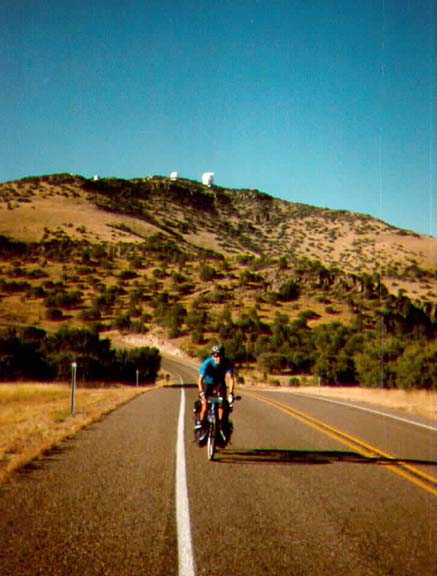At that point Todd and Jimmy left the store and were the lead group. Oliver and I left shortly afterwards. As we left I-10 and rode toward the McDonald Observatory, the vegetation changed from mostly desert to grasslands used for cattle grazing, and small hills began to appear. At the 60 mile point, we started to climb. We were already tired, and the climbing was difficult. We climbed for the next 12 or 13 miles, finally catching Todd at a rest area just before the observatory. Bruno showed up shortly afterwards. A 2 mile road leads from the visitor's center to the telescopes atop the hill and we debated the merits of climbing to the top. This is our last real climb of the trip, and Oliver and I agreed to try it. I thought Emory Pass was the last difficult climb, but the road to the top was the steepest, hardest climb of the trip. I was standing in my lowest gear for most of the way. Once there we climbed up the 5 flights of stairs to the visitor's area to get a view of the 107" telescope. The Univ. of Texas chose this spot because of the high percentage of cloud-free nights and the lack of lights in the area. There is a beautiful view of the surrounding Davis Mountains from the peak.
