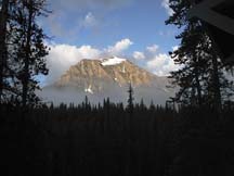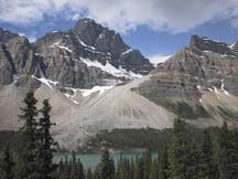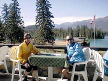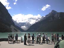 As is often the case, we didn't get much rest on the "rest day". On our way to breakfast at the Chateau on the lake, about a 1.5 mi. walk from the bungalow we saw Dick heading back to the lake and we hitched a ride. Most of the group had been out for an early lunch and were going for a long hike with Dick and Carol. We opted to sleep in and take a short hike from the lake. There are two small peaks nearby, Little and Big Beehive. On the way was a teahouse nestled beside a small lake where tea, cookies, and soft drinks are served by college kids who spend the summer there, returning to the lake 2 days a week. The views of the many lakes in the area were spectacular and we took 2 rolls of pictures. It made for a tiring day, especially since we didn't carry enough water for what turned out to be a long hike. Unfortunately dinner was a repeat of the long slow dinner at Radium Hot Springs, mainly because it was far enough away that we needed to ride in the van, and couldn't stagger our arrival.