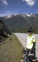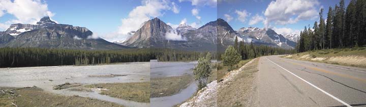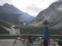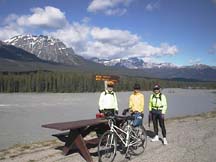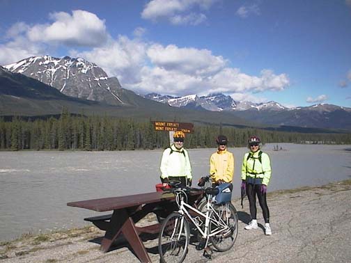 We were finally able to leave the Trans-Canada highway and most of the truck traffic when we headed north on the Icefields Parkway toward Jasper. This stretch, that would take us 3 days to traverse, was the most beautiful of the trip. We were in the middle of Banff and Jasper National Parks and the mountains were spectacular. Our destination that night was Saskatchewan Crossing, a gas station, tourist store and motel near where the parkway crosses the Saskatchewan River. There were a few climbs but nothing extreme. Peyto Lake was an optional side trip, a short climb on an asphalt trail where we joined the motorized tourists on one of their few forays outside their vehicles. I continued to use up film on the spectacular vistas. We also started to see more cyclists, including another Timberline group that caught up to us at Lake Louise, and a Backroads group that always seemed to have their bikes sitting atop their support vehicle. We had an OK room and dinner at the Crossing and once again weren't motivated to try the spa.