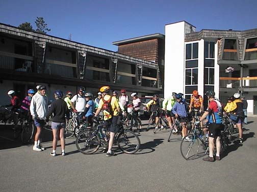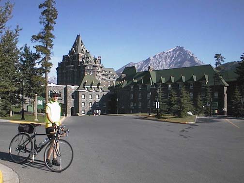 Our room at Rundlestone Lodge was very nice but we didn't have much time to enjoy it since we needed to put our bikes together again and check out the town of Banff before dinner next door. We met a few more people at dinner, then the group gathered in a spare storage room at the hotel to hear the orientation talk by Dick and Carol. It's not often that we have the owners of the tour company as our guides, but Timberline isn't an ordinary tour company. Besides running the business Dick and Carol go on several of their own tours each summer, schlepping bags and humoring the guests. Unlike most other tours, we weren't subjected to the round of self introductions, but later wished we had at least called out our names as it took a few days to figure out everyone's name and where they were from.