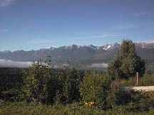 Cool rain continued throughout much of the day's ride to Radium Hot Springs along Rt 93. Traffic was steady and fast; it seems that no one obeys the speed limit, and from a display at one of the roadside stands, it is reflected in the high number of animal deaths. The route mostly followed the Kootenay River through a glacial valley surrounded by snow-covered peaks.
