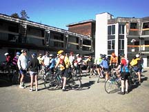 Earlier we were told that the road may be closed due to fires on the surrounding hillside. We saw the burn area as we rode by, the fire temporarily halted although still smoldering in the ground. Some of the roads leading into that forest to the west were still closed. While stopped for one of the rare peanut butter and jelly sandwiches from the support van an Edmonton racing club came flashing by. It was surprising to see them since the road was very rutted and rough. We heard later that some of the riders had taken a spill on an early stretch the road.