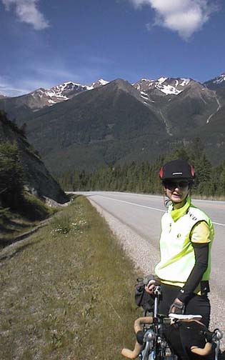 The only real climb was the last mile or so from the town of Golden to our motel atop the surrounding cliff, the Golden Rim Motel. Golden is a working town with a small college, unlike the tourist towns of Banff and Lake Louise. When we arrived at the motel the pool was full of fellow riders, with a view overlooking Golden and the river valley. Many of us stopped in Golden for drinks and snacks, including Marilyn, who left her rack-top bag open with her wallet sitting inside. It fell out on the way out of town. Once she arrived at the motel she realized that it was gone so she and Carol hurried back down and discovered that it had already been turned in to the police station. As Marilyn walked into the station the officer there said 'you must be Marilyn'.