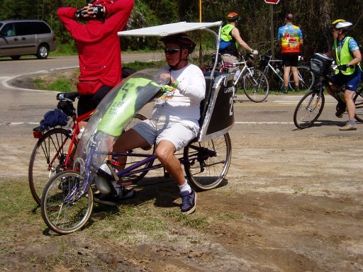 One of the more interesting bikes we encountered on the ride was the "Chopperoo", a Rans Stratus customized with front and rear fairings and a sun canopy. The fairings are probably needed to counteract the drag of the canopy, but it sure cuts down on the amount of sun screen required. The owner must be from Florida.
