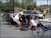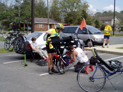 Once we arrived in Quincy we quickly parked out bike under a covered walkway, reluctant to part with it for the night but having little choice since our motel was located 20 miles away. Since we were not able to make reservations at any of the official motels, we had booked a room in a motel on the west edge of Tallahassee and planned to take the Bike Florida motel shuttle to the closest motel, pick up our bags, and take a taxi from their to our motel. During the long wait for the bus in Quincy we talked a length with a retired FBI agent who regaled us with tales of his days as a G-man. We also shared stories about our Bike Friday's.