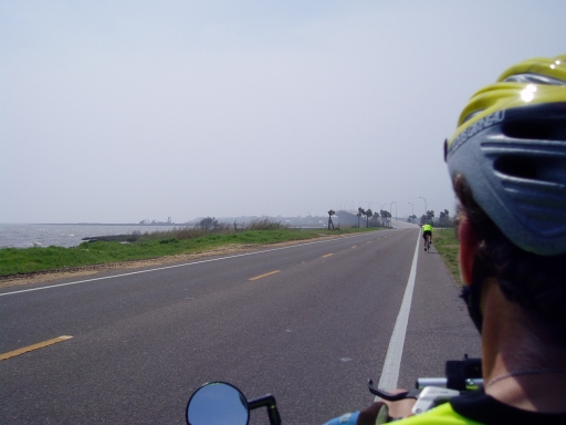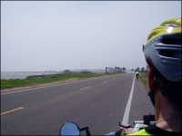 The worst was yet to come. As we approached Apalachicola, a long bridge and causeway loomed ahead. The wind had been strong throughout the day, coming from the south and as we turned west toward Apalachicola we had to lean left to keep from getting blown over. This was bearable on the main road. On the bridge it seemed life threatening.