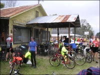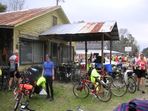 The terrain for the day's ride was rather boring, more pine trees and sandy soil. We passed through Apalachicola National Forest, the largest national forest in Florida, which includes Tate's Hell Wildlife Management Area within Tate's Hell State Forest. The state forest was purchased in the 90's from forest companies in order to help protect Apalachicola Bay. Just before the first rest stop it started to rain. Since it was less than a mile to the stop we (I) decided to try to make it before it rained hard. We didn't, but luckily the tour photographer had set up his tent nearby and we crowded under it with a couple of other riders to escape the rain. Kerie wasn't happy, since we had plenty of rain gear but hadn't stop to put it on.