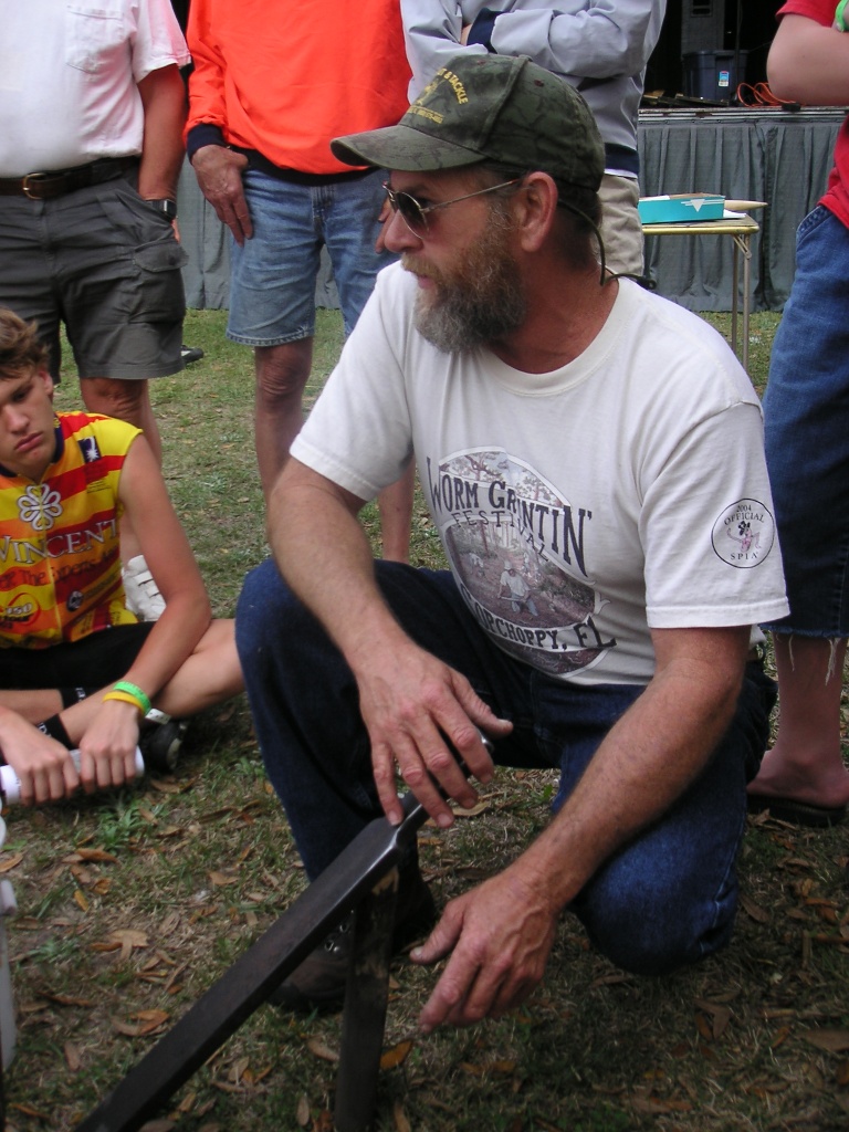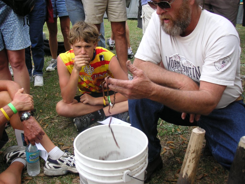 The grunter was a real woodsman, the “2004 Worm Grunting King”, who spends his days with his wife collecting worms to be shipped around the country and used as bait. We had a front row seat. As the wood was rubbed we could feel a tickling sensation in our feet. The ground was dry and the expectations were low for actually seeing any worms come out of the ground. Instead the grunter had bucket of already harvested worms on display.