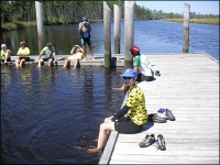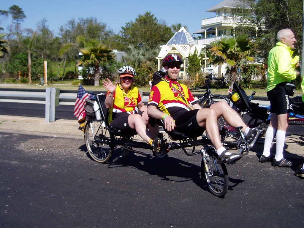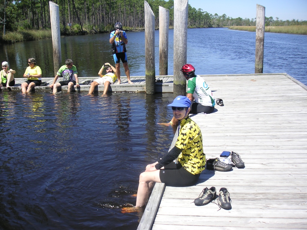 Ochlockonee River State Park where we joined other bikers in cooling our feet in the tannin-rich waters. Our bird-watching friend on the Rans V2 was excited that he had seen a red-cockaded woodpecker, known to inhabit the pine trees of the park.