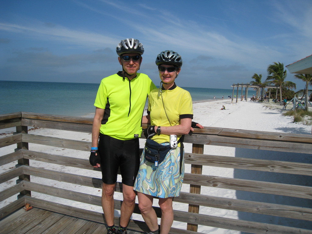 Later the trail turned into a narrow sidewalk over the causeway bridges and cyclists were competing with pedestrians and other cyclists for the limited space. That's when we got on the road and had no problems riding to Honeymoon Island State Park. There were peanut butter and jelly sandwiches and excellent grapefruit slices at the rest stop.