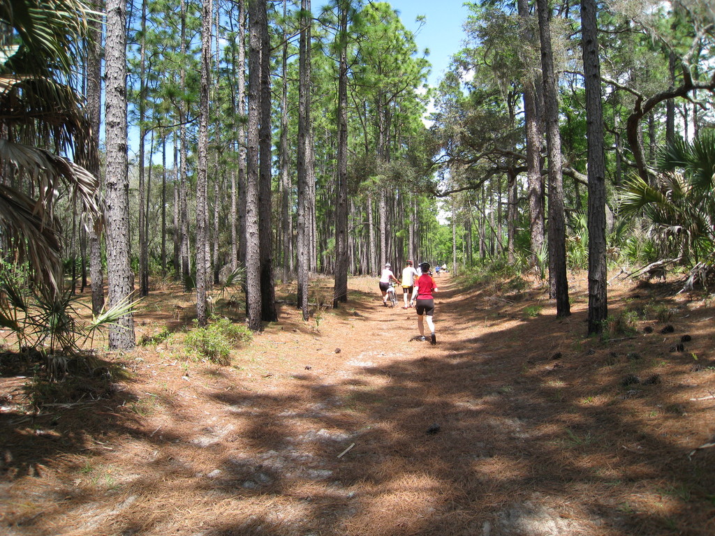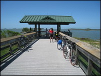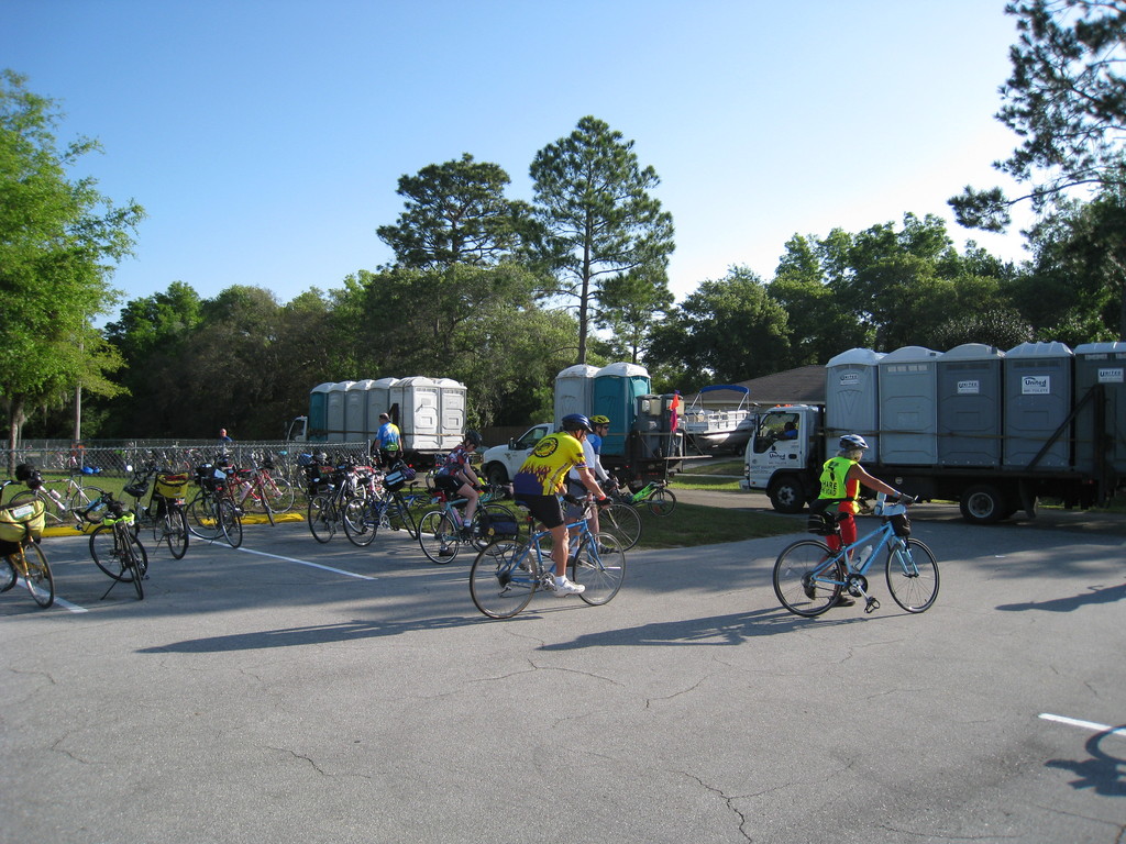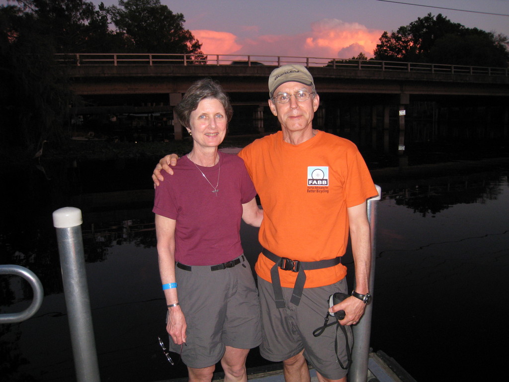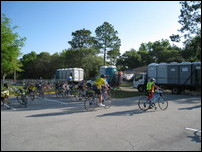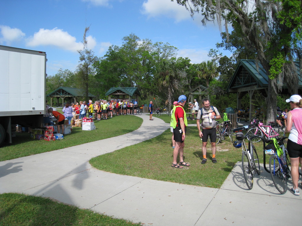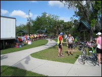 Characteristic of this year's tour, lunch was late and there were no port-a-johns. We waited in line as the box lunches were prepared. The vegetarian option was a tasteless sprouts and orange chunks wrap. Not nearly enough food for the long day, so it was supplemented with one of our energy bars. By the time we finished the lunch line had about doubled. After lunch was an optional ride to the Gulf on the Bay Trail, a pleasant stretch of trail along the Marjorie Harris Carr Cross Florida Greenway. The greenway is an aborted cross-florida canal, work on which was halted by environmentalists just as it was nearly completed. It's now a lush greenway and popular fishing spot.