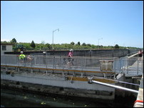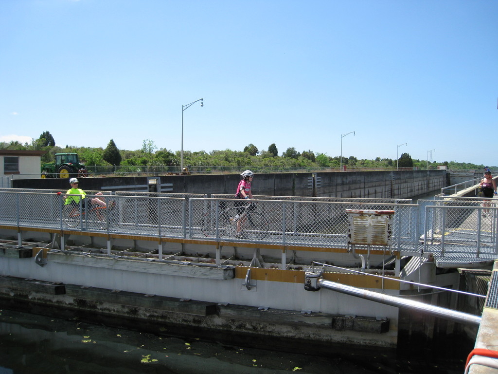 The sandy trail turned into a grassy field where we reached the non-functioning Inglis Lock on the abandoned Greenway canal. A lock keeper was there anyway. She offered us ice and answered our questions about the canal and lock. A large alligator floated below, trapped in the lock.