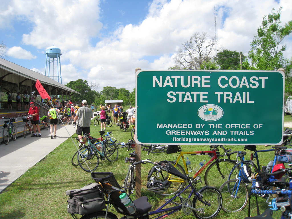 The final rest stop of the day was at the old train depot in Trenton, the head of the Nature Coast State Trail. It was a wide, smooth trail parallel to a major road. We decided to skip the optional ride to the "historic bridge". It didn't sound very appealing at this point in the trip. We were ready to get to our bags in case there was rain and to start our drive to Jacksonville.