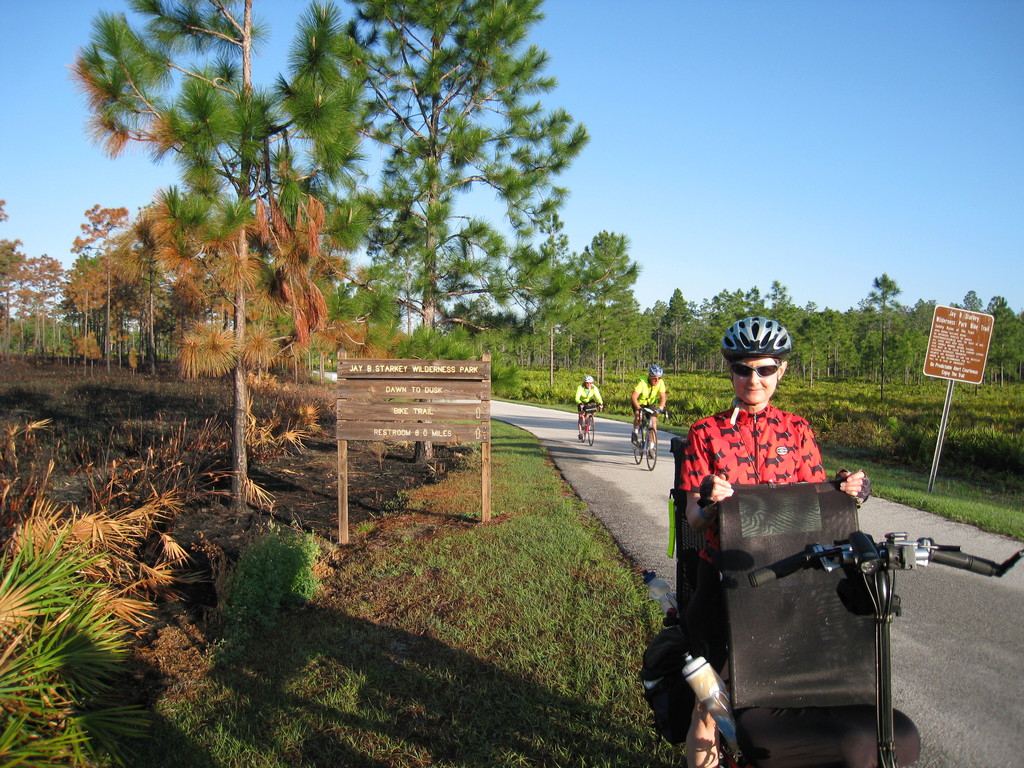 We started the day with a 7 mile ride to Starkey Wilderness Park, along Cecelia, Riverside Crossing, and Trouble Creek Road, with no problems and little traffic, despite warnings from Bike Florida staff. The first trail of the day was the Starkey Park Wilderness Trail, a good paved trail for about 6 miles that intersects with the Suncoast Parkway Trail. The Parkway trail was built at the same time as the parkway toll road, as part of a compromise with environmentalists. It's an excellent, wide trail with a smooth surface that is still in good shape. I hope that funds for maintenance of the trail were part of the deal.