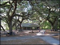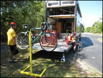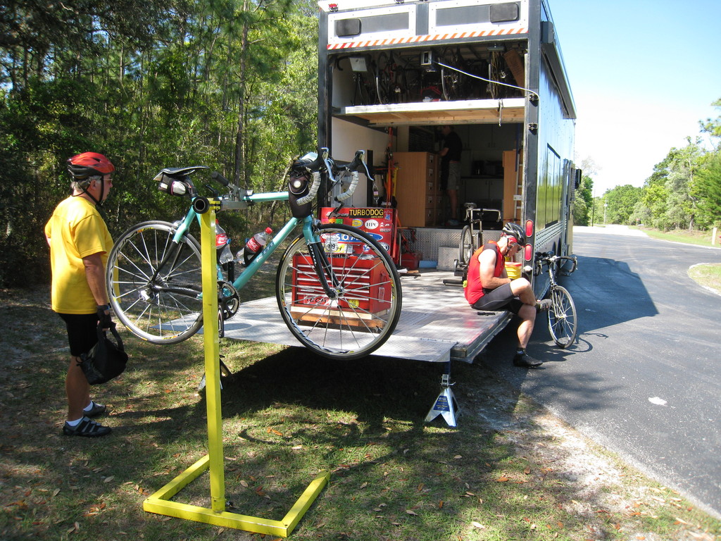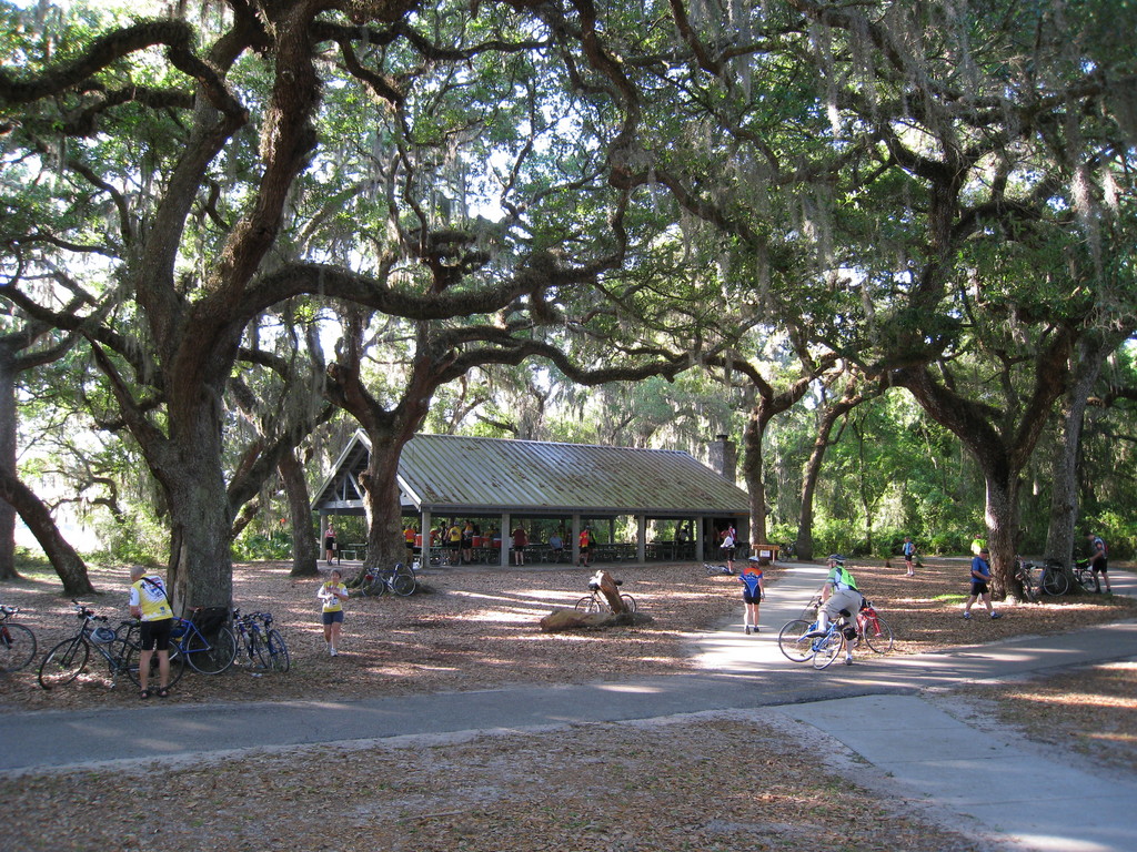 The first rest stop at Crews Lake Wilderness Park was OK although there were limited supplies and the volunteers had a hard time keeping up with the hungry cyclists. Crews Lake is mostly dry now with a few ponds of water where the wildlife congregate. We heard Sandhill cranes in the distance. In order to ride to the park we needed to exit the Parkway trail. The Bike Florida organizers seemed paranoid about having cyclists ride on roads, so we were forced to squeeze onto a narrow sidewalk for a few feet, then onto another narrow sidewalk along the next road. No cars passed on the roads. Police seemed more interested in making sure cyclists didn't ride on the road than in directing traffic.