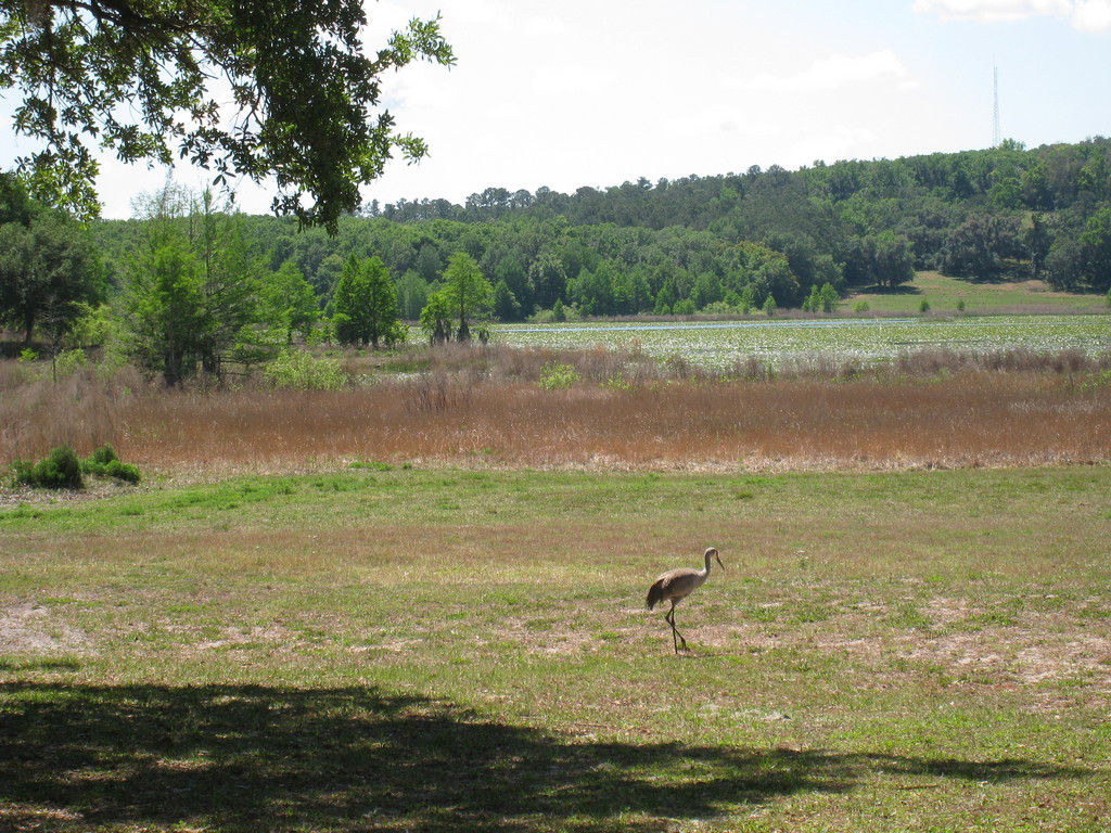 As we left the church we saw a Sandhill crane by the side of the road, with a beautiful red crest. As we turned around to take some photos it crossed the road and wandered over to the lotus pond behind the church.