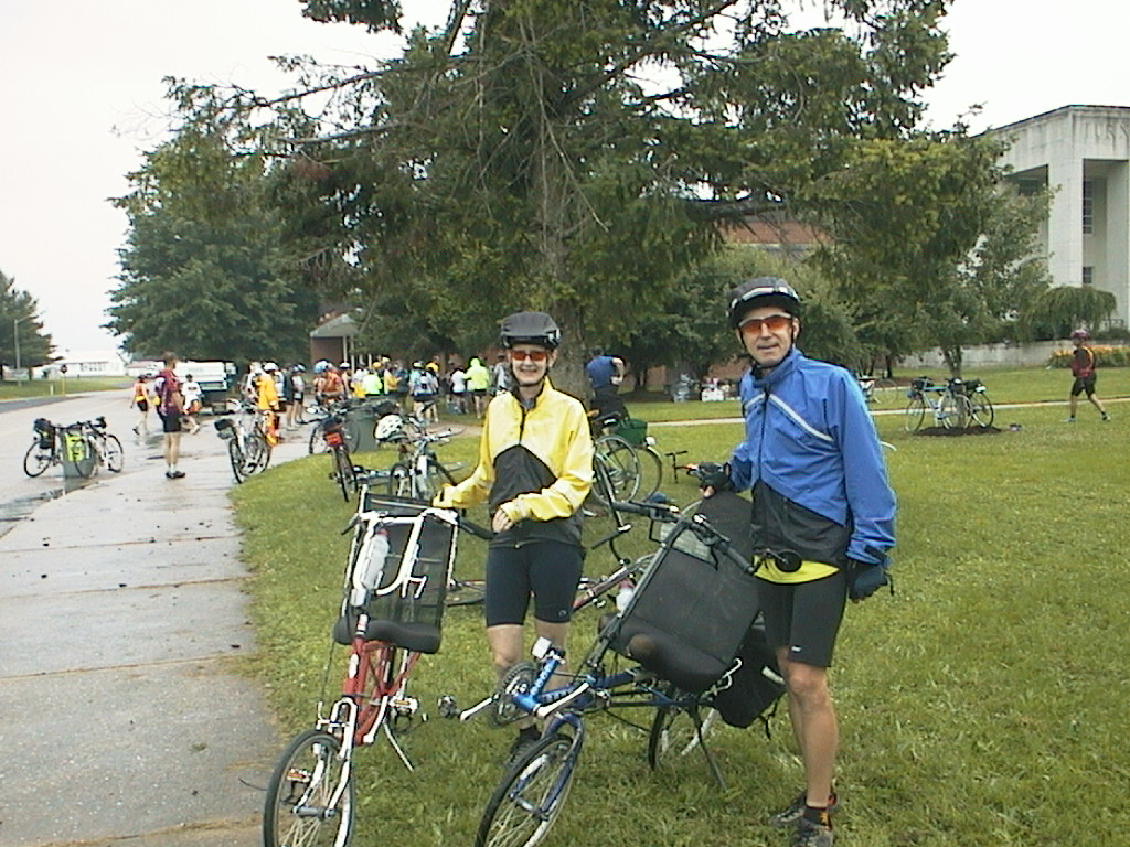 The rain continued as we arrived at Bridgewater College to pick up our baggage and pack the car. It's normally a challenge to figure out the logistics of parking the bikes, getting the car to pick up the bags, taking a shower, and packing the bikes. In the rain it's not much fun. We finally managed to get a shower and change into dry clothes, and sat under one of the large tents to enjoy the free lunch and celebration cake. The bags were wet, but we had packed all our gear in plastic bags so we fared OK. The bikes were covered with grit, and we later spent the rest of the evening in Reston cleaning them.
