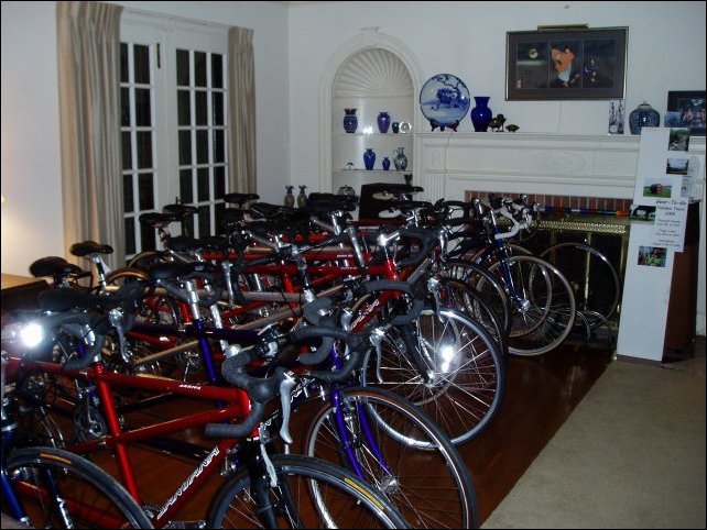 High-end tandems filled the living room. The accessories are located in the back room, and I picked up a replacement pair of Burley rain booties, hoping they would fend off any rain during the trip. The gathering was a good way to got to spend a few minutes with most of the people on the tour. Then it was back to the motel to try to finish packing and separating what we would carry for the week from what we would leave in the car for the final 2 days of the trip.