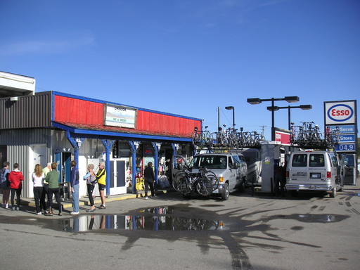 | Gas stop on drive to Banff | Unloading bikes at lunch | Kerie at Castle Mountain overlook |