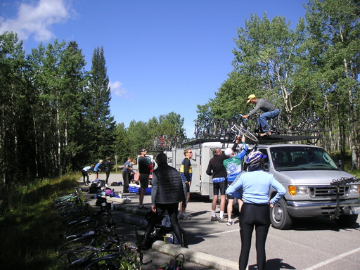 During the night I woke up and looked out our window to see a magical scene of the village below, amber streetlights glowing and a full moon overhead peeking out between the clouds. There was full cloud cover when we got up and it started to burn off as we left the hotel. Our day started with a four hour shuttle ride to the Bow Valley Parkway and the start of the day's ride.