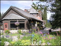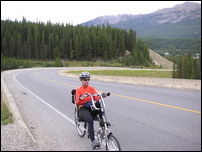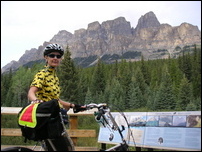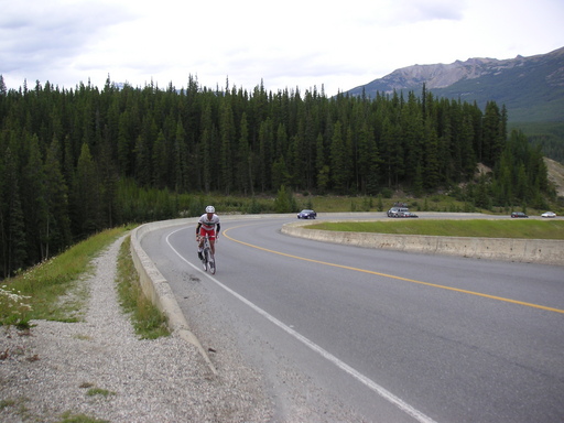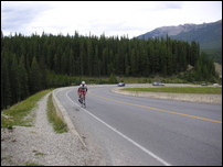 The cue sheet indicated that the steep climb to the lake from the village of Lake Louise was to be avoided and that the van would shuttle riders the final 2.2 miles. Although we were tired, we were game for riding the last bit so we headed up the climb, the steepest of the entire trip. Doug caught us about 1/2 way up, just as the van passed us. He powered up out of sight in no time as we spun in our low gears. We passed the Great Divide road that we had used the last trip when we rode from Golden, and the Paradise Lodge where we stayed then, in 2000.