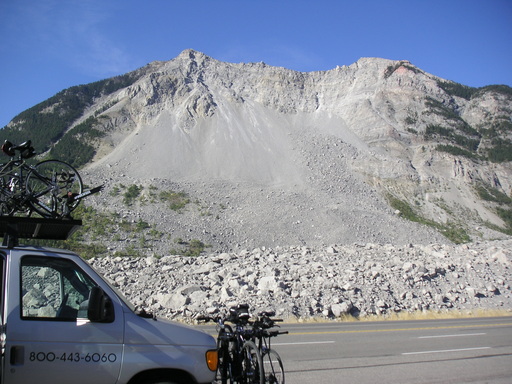Because our bike boxes were stored in Whitefish, we spent the day shuttling from Calgary to Whitefish. In hindsight it would have made more sense to ship the boxes to the hotel in Calgary and fly home from there. The van ride was pleasant enough, along the wide open plains and foothills south of Calgary. We would be crossing into the U.S. at Roosville. We stopped briefly at Frank Slide where a huge limestone landslide had killed 70 people in 1903. After we said our goodbyes at the Grouse Mountain Lodge, the guides continued their journeys either back to Washington with the vans or to Utah for the next trip. The California contingent left by car.