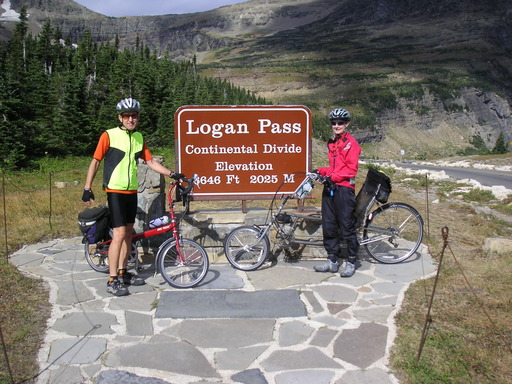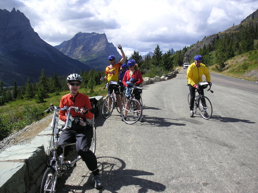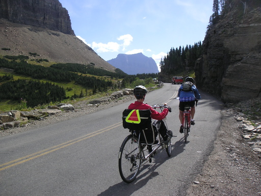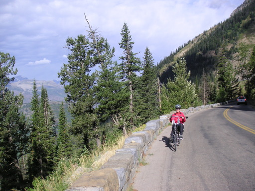 As usual Kerie and I were among the last to leave, just after 7:30. We had prepared for a cold start but the temperature was mild and we donned light jackets without our extra layers. I packed my extra clothes in my panniers, and throughout the week I carried about 20 extra lbs. on the bike. There was little traffic along the shaded ride from Lake MacDonald to the first part of the climb. Before we knew it we were at The Loop, the one major switchback on the road.