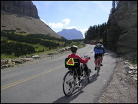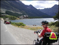 The ride out of the park was one of the better rides in a while; beautiful scenery, a slight descent, and a strong tailwind. Somehow the tailwind continued as we headed north toward the town of Babb located on the Blackfeet Indian Reseveration. We made decent time to the Many Glacier turnoff, waving to our cohorts at the corner store as we made the turn into the wind. It was a long 12 mile ride to the hotel. Brandon caught up with us and was with us when we entered the park. From there we fought the wind, at times nearly getting blown off the bikes. At one point Kerie stopped in the middle of the road because of the wind. The hotel was a welcome sight, although going over the bridge just before the hotel we nearly lost it again.
