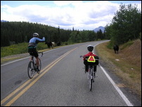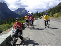 Several mountain goats greeted us as we entered the parking lot of the hotel. We were the last to arrive, and we discovered later that there were only 3 guests who rode the entire route, us and Mike from Georgia. We were tired and ready for a hot bath. We had dinner at the hotel after a brief wine and cheese party sponsored by the Bicycle Adventures crew. At dinner we got to know Lou and Rebecca from San Diego. Next to us sat a group of cyclists from Seattle that Doug the guide knows from his racing career. They were on a credit card tour carrying only small day packs. Tomorrow we ride 50 miles into Canada and Waterton Lakes National Park.