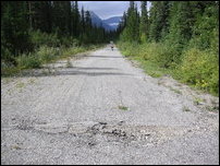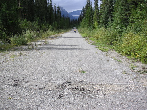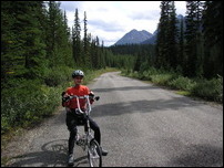 The return ride involved a short climb before the long descent back to Lake Louise Dr. We turned left toward Lake Louise and then turned right onto the Gread Divide trail, formerly the main road to Lake Louise, now abandoned and open to hikers, bikers, and cross country skiers. The asphalt surrounding the road culverts had slumped and the culverts became formidable speed bumps. The roadbed has not been maintained, so our progress was relatively slow.
