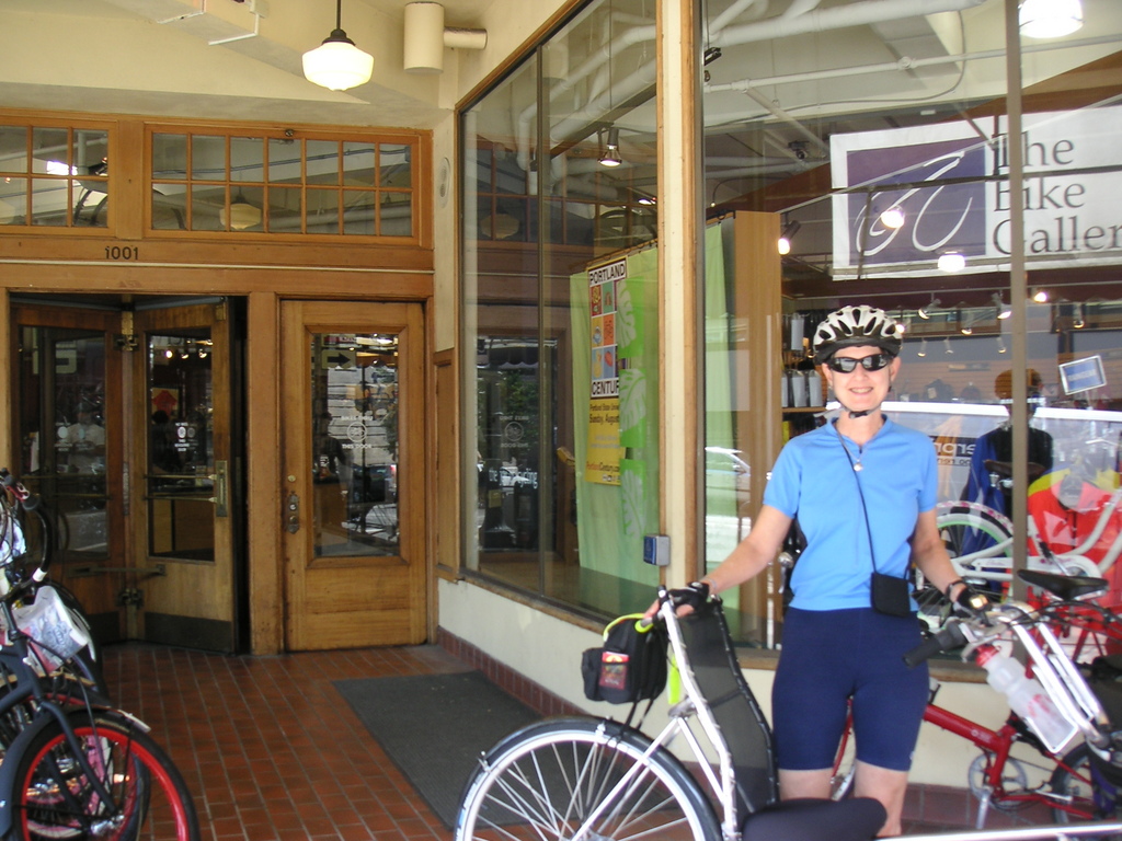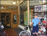 We crossed the Willamette on the Hawthorne Bridge and continued on Hawthorne Blvd. to Coventry Cycle Works to check out their selection of recumbent bikes. We knew we were in the right place when, as we approached the store, we spotted a women test riding an EZ-Sport. They had a small but neat collection of bents, EZ-Sport, EZ-1, Tour Easy's, Burleys, and Bacchetta's. The also had a couple of tadpole trikes. Their selection was not as diverse as ours at bikes&vienna, but it was a very attractive, well-laid out store.