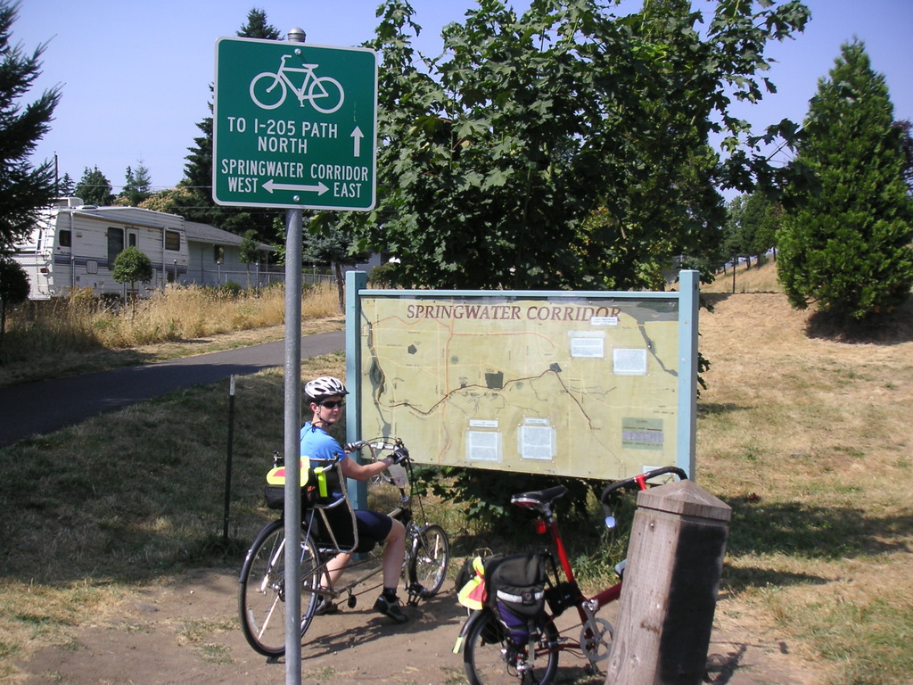 One of the store clerks talked to us briefly about the trail we would ride and he gave us good directions for getting there from the store. As we rode further from the downtown area, the edge of the trail was lined with blackberry bushes heavy with fruit, and they smelled delicious. Occasionally we'd see people with their buckets picking the ripe fruit. One section of the trail faces Mt. Hood in the distance and on a clear day the view is said to be excellent. There must have been smoke in the air that day because we could just barely make out the mountain's outline.