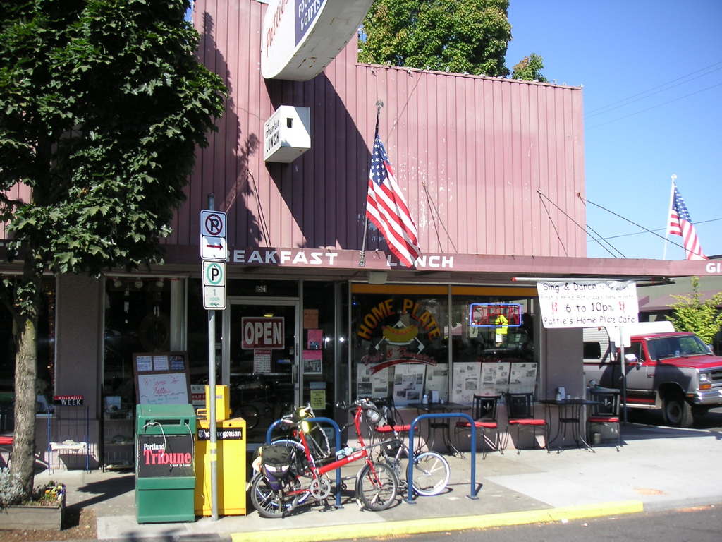 We followed the bike map and made our way from the outskirts of town to the downtown area. Along the way we stopped at a classic old diner, Pattie's Home Plate Cafe. It's located in the heart of old St. Johns, a small town that merged with Portland in 1915. Pattie was sitting at one of the tables, at one point stopping by our stools and asked us how everything was. The cherry Sprite was excellent, as was Kerie's root beer float. There was an interesting collection of used and new stuff taking up half of the cafe, and on certain nights the tables are cleared for a dance floor. It's nice to know that small town soda fountains like this still exist.
