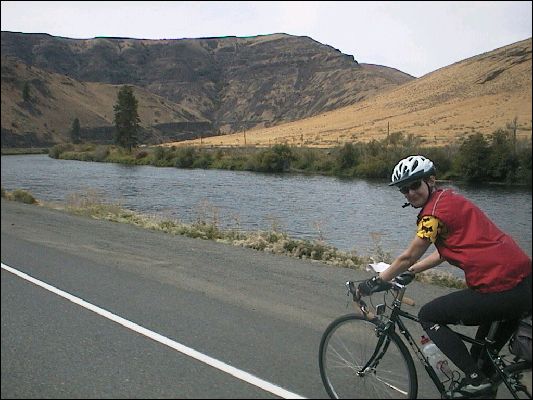 Later we rode through the Yakima River Canyon for a long stretch. The river was lined with cottonwood trees amidst the bare surrounding hills. This is dry country, in the rain shadow of the Cascades. Many trout fisherman plied the waters below in elegant-looking drift boats. Mark would occasionally pass us to ride ahead and take photos.