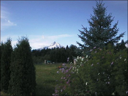 The early part of the ride from Hood River was a gradual ascent along low traffic back roads that wound through lush apple and pear orchards. The picking crews had already started the harvest as we passed. The morning was clear and we had views of Mt. Hood. Mark outdid himself with an excellent lunch at Sherwood Campground in the Mt. Hood National Forest beside the Hood River. His pineapple, grape, etc. fruit display was such that several photos were taken to preserve the moment. We also feasted on the fresh bagels that we had picked out that morning at the Hood River Bagel Co. and rhubarb pie for desert.![]()
