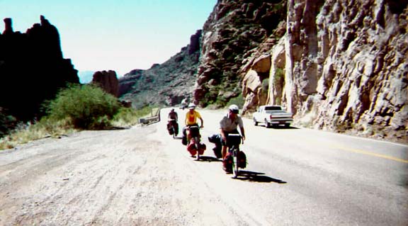 It was another windy day, although we had a tailwind for the first few miles from Apache Junction. I left relatively late, just before JimN, and stopped at mile 5 to get bottled water, as the water at the RV park was pretty bad. At about mile 17, I came across the rest of the group congregated outside of a convenience store which seemed odd since we are usually very spread out. Oliver had broken a spoke on the freewheel side, and the wheel was very out of true. Janet trued it as well as possible given the conditions, but she thought it would be best to either have the wheel replaced, or to get a new wheel. We were going to be doing some serious climbing in the days ahead, and it would be best to get it fixed while we were near a good bike shop. Oliver and Jimmy hitched a ride with a couple and their baby, JimN stayed with the bikes, and the rest of us headed off.